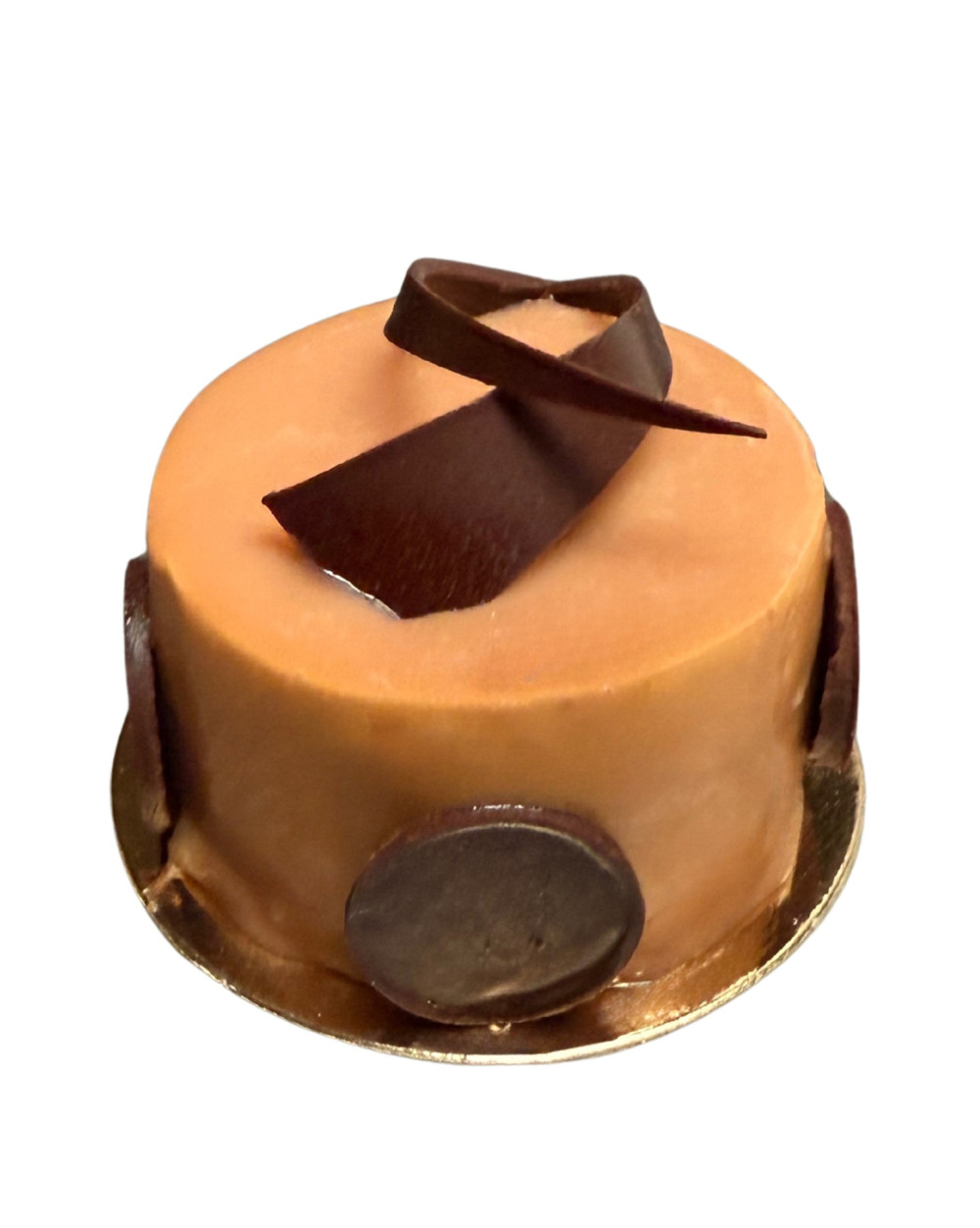 Un irrésistible mariage de saveurs autour du caramel : une dacquoise noisette moelleuse, un cœur fondant de caramel au beurre salé, un crémeux vanille délicat et une bavaroise caramel onctueuse pour une harmonie douce et gourmande.