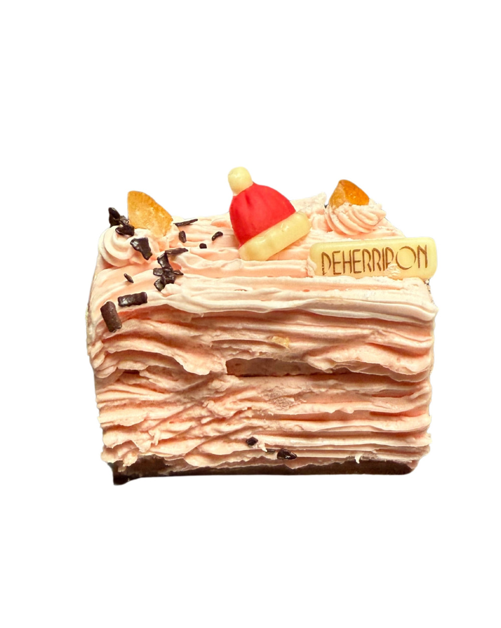 Une création délicate associant une crème au beurre légère et parfumée Grand-Marnier (alcool à l'orange), une génoise moelleuse et un biscuit sablé qui apporte une irrésistible touche de croquant.